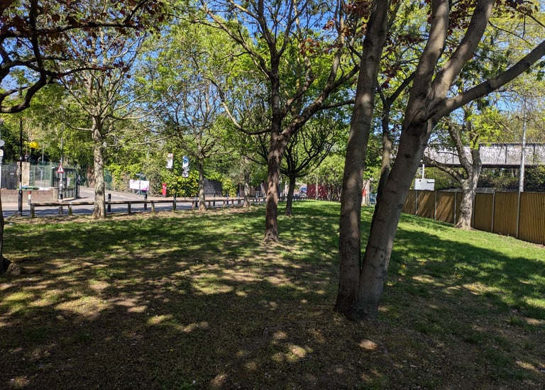 At the foot of Westcombe Hill, just before the railway bridge and adjacent to the A102 dual carriageway, is a wedge-shape parcel of land that is currently mostly grass with a number of mature trees. As with the site at Siebert Road, it is bounded on its eastern edge by the timber panel fence bordering the road.